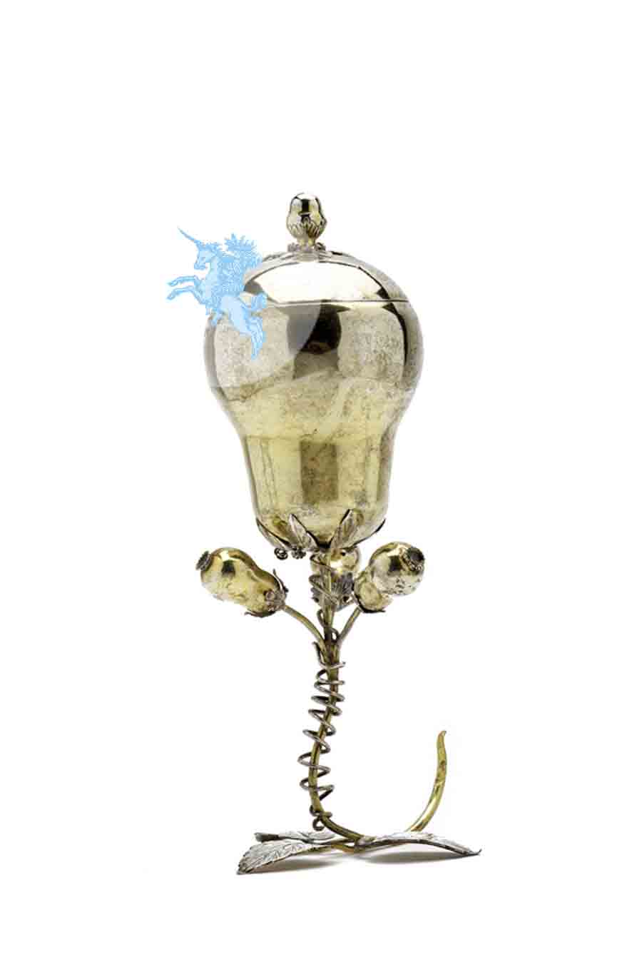 Durch seine naturalistische Formgebung zeichnet sich der vorliegende Birnenpokal als hochwertige Arbeit süddeutscher Goldschmiedekunst aus: Der Pokal ruht auf drei Blättern, über denen sich ein dünner Stiel mit spiralförmiger Einfassung erhebt. Aus dem Stiel erwächst die birnenförmige Kuppa, die von drei kleineren Birnen eingerahmt ist. Die Stadt- und Meistermarken am Lippenrand und auf dem Deckel belegen, daß es sich hierbei um ein Werk des Nürnberger Goldschmiedes Oswald Haußner (Meister 1637-1671) aus der Zeit um 1650-1657 handelt. Haußner war auf prunkvolle Trinkgefäße, von denen sich verschiedene in der Staatlichen Eremitage in St. Petersburg, im Germanischen Nationalmuseum in Nürnberg und im Museum angewandte Kunst in Wien erhalten haben. Die prunkvollen Apfel- und Birnenpokale wurden vorrangig in den zwei Zentren der süddeutschen Goldschmiedekunst angefertigt: in Nürnberg und in Augsburg. Dabei konnten die Goldschmiedemeister auf fantasievolle Gefäßentwürfe von Nürnberger Graphikern wie Virgil Solis zurückgreifen, die das spätgotische Formenrepertoire der Goldschmiede entscheidend erweiterten. Den Höhepunkt ihrer Beliebtheit erreichten die obstförmigen Deckelpokale Nürnberger und Augsburger Goldschmiede in der ersten Hälfte des 17. Jahrhunderts: Insbesondere Ananas- und Birnenpokale zählten zu den unverzichtbaren Tafelrequisiten höfischer Prägung. Seit dem 16. Jahrhundert waren an deutschen Höfen prunkvolle Trinkgefäße aus feuervergoldetem Silber besonders beliebt, deren Kuppa als Apfel oder Birne mit einem Schaft in Form eines Baumstamms oder Astes gestaltet waren. Diese aufwendigen Goldschmiedearbeiten galten meistens als kostbare Objekte fürstlicher Repräsentation und Wertanlage zugleich, die in Notzeiten wieder eingeschmolzen und wortwörtlich „vermünzt“ werden konnten. Aufgrund ihres hohen künstlerischen und materiellen Wertes wurden sie meistens in den gesicherten Räumen der Schatzkammer aufbewahrt, zu denen lediglich der Fürst und sein Kämmerer Zugang hatten. Anläßlich höfischer Festlichkeiten, etwa bei Geburten, Hochzeiten, diplomatischen Empfängen o.ä., wurden die kostbaren Deckelpokale aus der Schatzkammer geholt und auf der fürstlichen Tafel bzw. auf einer drei- oder fünfstufigen Kredenz hinter der Tafel als Zeichen von Macht und Wohlstand aufgestellt.