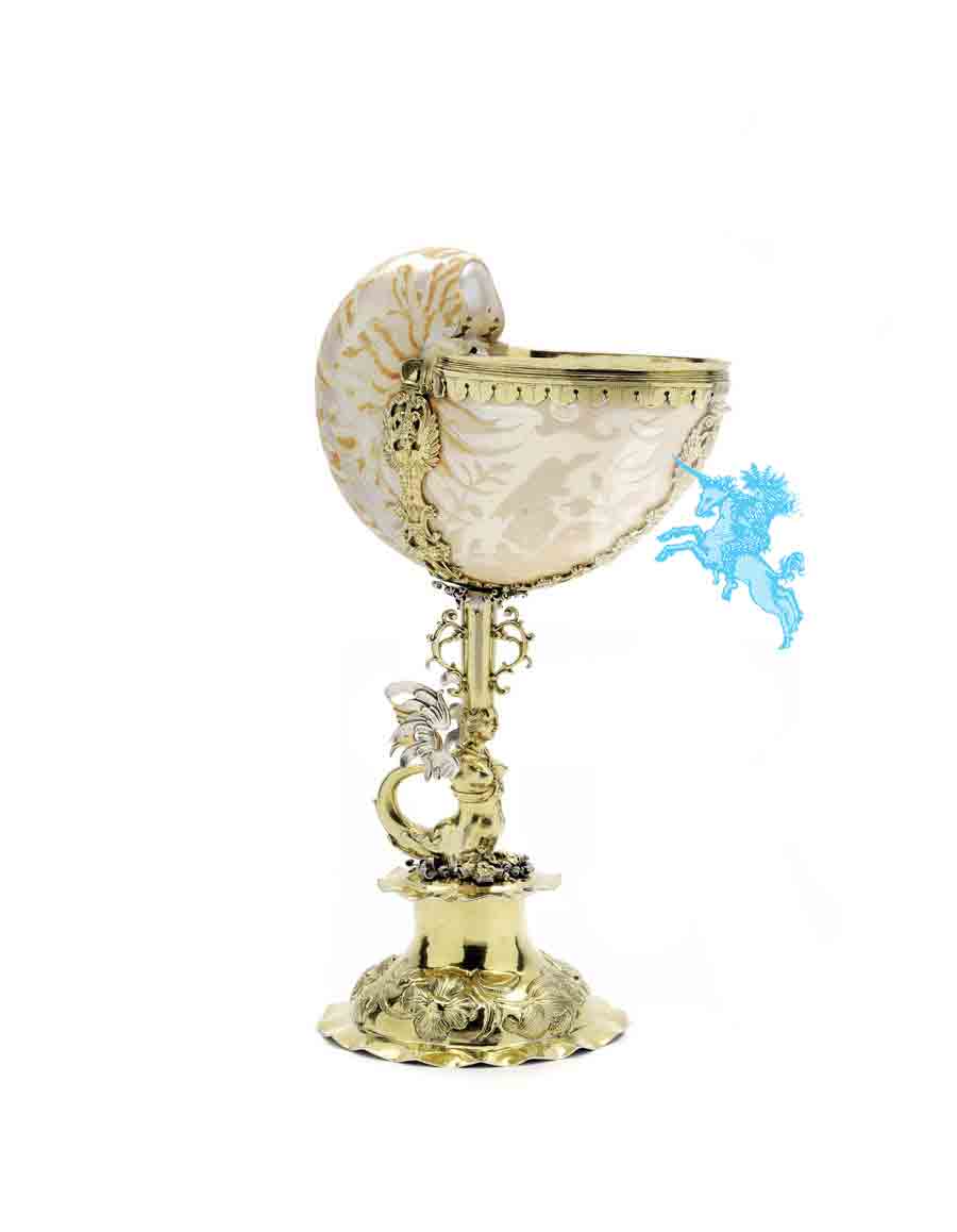 Der prunkvolle Nautiluspokal zeichnet sich sowohl durch die geätzte Dekoration der Schale als auch durch seine elaborierte Silbermontierung als ein höfisches Kunstwerk ersten Ranges aus. Die delikate Verzierung der fragilen Konchylie und die feine Goldschmiedearbeit werten den exotischen und kostbaren Charakter dieses barocken Kunstwerkes auf, das als besonders wertvolles Artificialia zur Aufstellung in einer Kunst- und Wunderkammer entstanden ist. Daß es sich hierbei um ein fürstliches Sammlungsobjekt handelt, zeigt sich deutlich an der Provenienz des Pokals, der seit den 1860er Jahren im Besitz der Grafen Wachtmeister auf Schloß Knutstorp in Schweden war und der ursprünglich wohl aus den königlich-schwedischen Kunstsammlungen stammt. Im Nationalmuseum in Stockholm befindet sich das Pendant zu dem vorliegenden Pokal, das nachweislich Karl XV. von Schweden (reg. 1859-1872) gehörte und erst nach dessen Tod 1873 als königliches Vermächtnis in die Bestände des Museums einging. Bei dem Stockholmer Nautiluspokal und seinem hier besprochenen Gegenstück ist die Muschel mit exakt demselben gezackten Lippenrand und mit denselben ornamentierten Spangen gefaßt und erhebt sich über einer Fußzone, die den gleichen Aufbau verfolgt. Allein die Schaftfigur wurde bei dem Stockholmer Pokal wohl infolge einer Restaurierungsmaßnahme ersetzt und unterscheidet sich daher von der geflügelten Sirene, auf deren Kopf der hier besprochene Nautilus ruht.