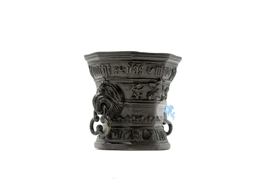 Mit seiner facettierten, achteckigen Wandung, seinen fantasievollen Griffträgern in Gestalt von Greifvogelköpfen und seinen dreipassigen Griffringen stellt der vorliegende Mörser ein einzigartiges Meisterwerk deutscher Bronzekunst dar, das mehrfach publiziert und wiederholt als das Spitzenwerk des Klever Bronzegießers Albert Hachman beschrieben wurde. Weltweit lassen sich lediglich zwei weitere Mörser mit oktogonaler Wandung von Hachman nachweisen: Der erste, 1533 datiert, befindet sich in den Sammlungen des Rijksmuseum in Amsterdam und der andere, 1547 datiert, im Musées royaux d’art et d’histoire in Brüssel. Beide weisen vergleichbare Gestaltungsmerkmale auf, haben ungefähr die gleichen Maße wie das besprochene Werk und werden von Löwenköpfen als Griffträger verziert. Verglichen mit diesen zwei Werken fällt die ausgesprochen hohe, plastische Qualität und das ausgewogene Verhältnis von Inschriften und Ornament auf, die den Mörser mit den Greifvogelköpfen als Hauptwerk auszeichnen. Zehn Jahre nach dem Mörser in Amsterdam und ein Jahr nach dem Mörser in Brüssel entstanden stellt das besprochene Objekt zweifelsohne den Höhepunkt einer künstlerischen Entwicklung dar, die mit der Blüte der Hachman-Werkstatt um die Mitte des 16. Jahrhunderts übereinstimmt.
