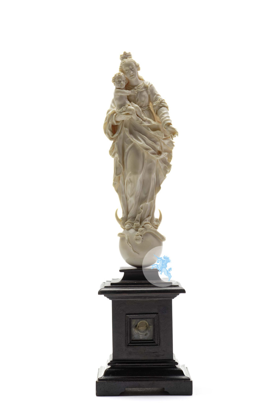 Über der Erdkugel und der Mondsichel erhebt sich die majestätische Figur der Madonna mit Kind. Sie tritt mit dem Fuß auf die Schlange, die sich um die Erdkugel windet, in einen Apfel beißt und somit auf die Ursünde verweist. Maria ist hier nicht nur als Himmelskönigin mit bekröntem Haupt dargestellt, sondern auch als apokalyptische Madonna entsprechend der Offenbarung des Evangelisten Johannes: Sie steht für die schwangere Frau „mit dem Mond unter ihren Füßen“, die von dem Drachen bedroht wird und deren Erscheinung das Jüngste Gericht einläutet (Offb. 12,1-5). Die dynamische Komposition und der bewegte Faltenwurf des Gewandes kontrastieren mit der inneren Ruhe und Milde, die das Gesicht der Jungfrau ausstrahlt und die dem Gläubigen Erlösung durch Fürsprache der Mutter Gottes verspricht. Ihr Haupt neigt sie leicht zum nackten Jesuskind, das sie auf dem linken Arm hält. Die rechte Hand erhebt sie in einer grazilen Geste, als würde sie den Betrachter ansprechen. In der aufwendigen Gestaltung ihres faltenreichen Gewands, in den fein geschnittenen Gesichtern und den zierlichen Händen der Mutter Gottes kommt die außerordentliche Begabung des Bildhauers zum Ausdruck, der sein Werk auf der Rückseite der Erdkugel mit der Inschrift „. G . FVX“ signierte. Autor dieser äußerst hochwertigen Statuette ist somit der süddeutsche Bildhauer Hans Georg Fux, der für seine besonders feinen Elfenbeinskulpturen religiösen Charakters bekannt ist und von dem sich weitere, signierte Arbeiten in Privatbesitz, im Bayerischen Nationalmuseum in München, im Gäubodenmuseum in Straubing, im Museum für Kunst und Gewerbe in Hamburg und im Kunstgewerbemuseum in Berlin erhalten haben.
