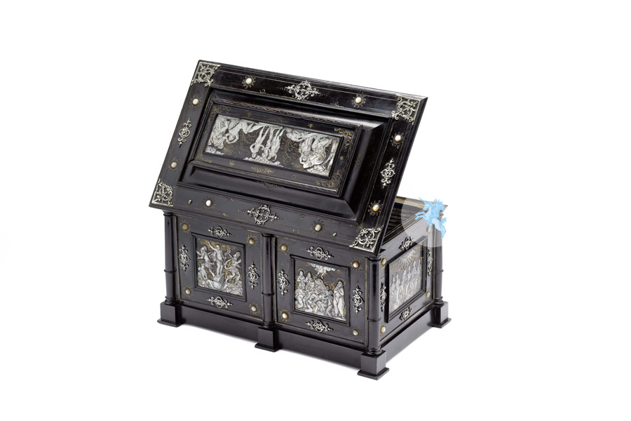 Über einer niedrigen, leicht verkröpften Basis erhebt sich der Korpus der Schatulle, der durch Halbsäulen gegliedert und eingerahmt wird und mit einem Kassettendeckel bekrönt ist. Die schlichte Formgebung der Ebenholz-Kassette wird nicht nur durch durchbrochene Silberbeschläge bereichert, sondern auch durch gravierte und goldgemalte Ornamente, kleine, runde Perlmuttcabochons und gravierte Perlmutteinlagen, die rund um zu figürlichen Szenen in sechs quadratischen Feldern gruppiert sind. Dargestellt sind Episoden aus dem alten und neuen Testament. Angefangen mit der Erschaffung Adams und Eva und der Sündenfall auf dem Deckel wird dem Betrachter die Passion Christi vorgeführt: Auf der Vorderseite ist die Ankündigung und die Anbetung der Hirten zu sehen, auf der linken Schmalseite die Kreuzigung Christi, auf der Rückseite die Auferstehung und die Himmelfahrt Christi und auf der rechten Schmalseite die Ausgießung des Heiligen Geistes. Daß es sich bei dieser kostbaren Kassette um eine Schmuckschatulle handelt zeigt die Gestaltung des Inneren: Öffnet man den Deckel zeigt sich auf der rechten Seite des Kasten einen Ringeinsatz und zwei kleine Schubladen für weitere Juwelen. Bei der prächtigen Schmuckkassette handelt es sich um ein Erzeugnis Augsburger Kistlerkunst. Dafür sprechen u.a. die eleganten Silberbeschläge, die sich auf einer ganzen Reihe Augsburger Ebenholzkabinette aus dem frühen 17. Jahrhundert in ähnlicher Formgebung wiederfinden und etwa aus der Werkstatt des Augsburger Goldschmiedes Matthias Wallbaum stammen könnten, bei dem sich viele Kistler Silberplaketten für ihre Prunkmöbel erwarben. Auch die Form der Schatulle mit ihren gliedernden Halbsäulen ist für Augsburger Möbel aus der ersten Hälfte des 17. Jahrhunderts charakteristisch. Gravierte Perlmutteinlagen gehören wiederum zum Repertoire süddeutscher Büchsenschäfter seit der zweiten Hälfte des 16. Jahrhunderts. In Nürnberg und in Augsburg integrierten Kistler das kostspielige Material in ihre hochwertigsten Erzeugnisse. Davon zeugt etwa eine Spielkassette im Hessischen Landesmuseum in Kassel, dessen Ebenholzfurnier ebenfalls mit gravierten und goldbemalten Ornamenten und mit Einlagen aus graviertem Perlmutt verziert ist. Auf die Augsburger Herkunft dieses Spielbrettes weisen auch die gravierten und teilweise feuervergoldeten Silberplaketten und -einlagen, die sich in nahezu identischer Ausführung beim Spielbrett im Pommerschen Kunstschrank wiederfinden. Letzteren hatte Hainhofer zwischen 1612 und 1615 in Augsburg für Philipp II. von Pommern anfertigen lassen. Demzufolge handelt es sich bei der Kasseler Spielkassette und auch bei der vorliegenden Schmuckschatulle um Augsburger Spitzenerzeugnisse, die im ersten Viertel des 17. Jahrhunderts entstanden sind.
