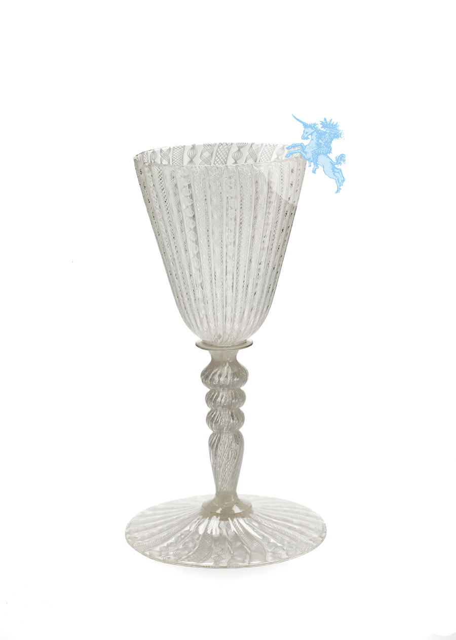 This fragile wine glass of retortoli glass, which has been preserved in perfect condition, is revealed by the faint pink tinge of the colourless glass and the form of the vessel as a typical Venetian piece from about 1700. Technical features also date the glass to the turn of the eighteenth century: after being made, the individual canes with milk-glass threads were coated with colourless glass so that the white stripes, twisted into spirals and criss-crossing, appear to lie at the centre of each individual glass cane. Retortoli glass canes from the sixteenth and seventeenth centuries look different, with the white threads encircling the cane of coloured glass on the outside. This technical innovation can first be observed in the filigrana glasses that have been displayed in the Glass Cabinet at Rosenborg Palace in Copenhagen since the eighteenth century, which were verifiably made before 1708. The glass works of art in the Rosenborg Glass Cabinet actually go back to a present made by the Venetian state to Frederick IV of Denmark when he was staying in La Serenissima in 1708. No wonder several glasses in the Glass Cabinet at Rosenborg Palace happen to match the glass discussed here in terms of colour, design and aesthetic qualities: they were all made at the same place at the same time.