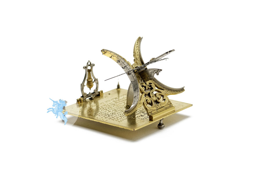 A folding plumb bob support and, across from it, an adjustable semicircular arc for the times of day in the morning and afternoon as well as a scale for latitudes 30–90° and a gnomon, which can be adjusted to the month, are set on a square dial-plate with levelling screws. The dial-plate is engraved with the names of thirty-seven cities and a table of latitudes. This is also where the signature of the artisan who made this piece is engraved: ‘Johann Martin in Augspurg’. A native of Frankfurt am Main, Johann Martin (1642–1721) moved to Augsburg, where he became a master clockmaker in 1669. Apart from mechanical timepieces, Martin also made sundials and did a flourishing trade in partnership with his younger stepbrother, Johann Willebrandt. That he definitely targeted a distinguished clientele is shown by this equinoctial crescent sundial with its sophisticated engraved and pierced decoration on fire-gilt brass and silver. A special feature is the ‘perpetual calendar’ (‘Imerwerender Calender’) with two discs as dials for the ‘months, days and signs of the zodiac’ (‘Monat des Jahrs und Sonen Lauff’), which Martin added to the reverse of the dial-plate to extend the functional scope of this magnificent sundial with a further horological ‘complication’.