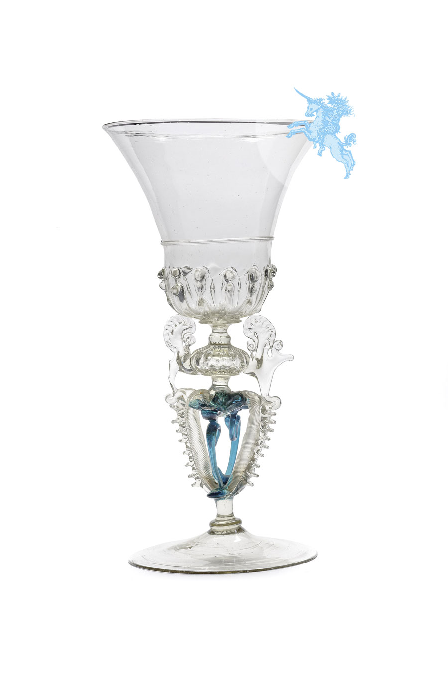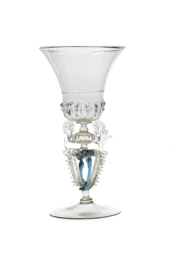 This thin-walled serpent-stemmed goblet of colourless and blue glass radiates lightness, elegance and sophistication. At first glance it looks like an outstanding piece of Venetian glass. It owes its gracefully coquettish appearance primarily to the imaginative stem with its extravagantly rich and unusual decoration: fragile looped threading of colourless and blue glass in an elaborate design stands proud of the stem on four sides to buttress it. The design of the bell-shaped bowl is also unusual because it is decorated with trailed pinched ribbing. Only a handful of glasses of this type, most of which were made in the late sixteenth century or even later in the seventeenth, are held at public and private collections. The prime example is a similar serpent-stemmed goblet from the Ernesto Wolf Collection, which has found its way into the Landesmuseum Württemberg collections in Stuttgart: the bowl reveals the same trailed pinched ribbing and the stem boasts four similar wings of blue and colourless glass. Other comparable, although less ornate, glasses are held at the celebrated Helfried Krug Glass Collection, the Victoria and Albert Museum in London, the Louvre in Paris and the Corning Museum of Glass.
