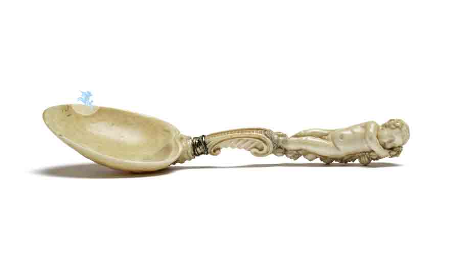 This superb spoon distinguished by a handle made as sculpture in the round and a bowl with relief on the back is a fine piece of figurative ivory carving on a small scale. The handle is formed as a putto, clasping his arms around a lush garland densely woven of grapes on the vine, apples and pomegranates flowing down his back. The nude childish figure stands on a C-scroll leading into the spoon bowl, on the back of which the usual spoon rat tail has been turned into a cartilaginous vertebrate spine with a suggestion of undulating ‘ribs’ subtly carved in what is known as the auricular style of decoration so popular in the seventeenth century. Comparable ivory sculptures depicting putti bacchanalia are diagnostic features of the work of Johann Georg Kern, a south German sculptor who specialized in carving reliefs on ivory tankard walls. His works found their way into collections amassed by European aristocrats and affluent patricians as valuable Kunstkammer objects. Just as Johann Georg Kern’s ivory tankards were not intended as drinking vessels, the magnificent ivory spoon presented here is purely a choice collector’s item rather than an eating utensil. Surviving seventeenth-century inventories of princely Kunst- and Wunderkammer indicate how highly prized such magnificent cutlery made of expensive materials was at that time. Because they were so fragile, only a very few pieces of cutlery of this kind made for display in collections are extant. The good condition of the present magnificent ivory spoon is, therefore, all the more remarkable. Two carved ivory spoons that are virtually identical to it are held in the collections of the Museo degli Argenti in Florence and the Bayerisches Nationalmuseum in Munich.