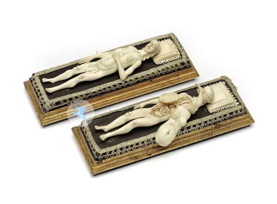 In the seventeenth century anatomical models in miniature form were among the most sought-after collector’s items for Kunst- and Wunderkammer. The Nuremberg workshop of Stephan Zick (1636–1715), an ivory turner, made ivory anatomical models, most notably of pregnant women, from which some of the individual organs were removable. The ivory body is furnished with movable arms and the abdominal wall lifts off to reveal the inner organs, including a uterus with embryo, which can also be disassembled. Several models of pregnant woman by Stephan Zick are extant in public museums and private collections, for instance at Museum für Kunst und Gewerbe in Hamburg and in the Olbricht Collection in Essen. Models of a man and a woman as a couple, however, are extremely rare. The present objects are the more noteworthy for being preserved in their original cardboard case still bearing its red wax seal. A comparable pair of anatomical models of a man and a woman belongs to collections of the Harvey Cushing / John Hay Whitney Medical Historical Library at Yale University. The popularity of Zick’s models is due to the avid interest early-modern-age collectors felt in anatomical knowledge but these ivory treasures are unlikely to have been used as teaching aids to illustrate medical issues. On the contrary, they are typical Kunstkammer objects, intended to whet visitors’ curiosity and provided with tactile qualities that invited exploration with a hands-on approach. At the same time the precious material used to make them and the superlative workmanship lavished on them in turning them into art indicates that models of this kind were viewed as artificialia of the first water, which, even more compellingly than other works of art, demonstrated man’s ability to penetrate the secrets of Divine Creation.