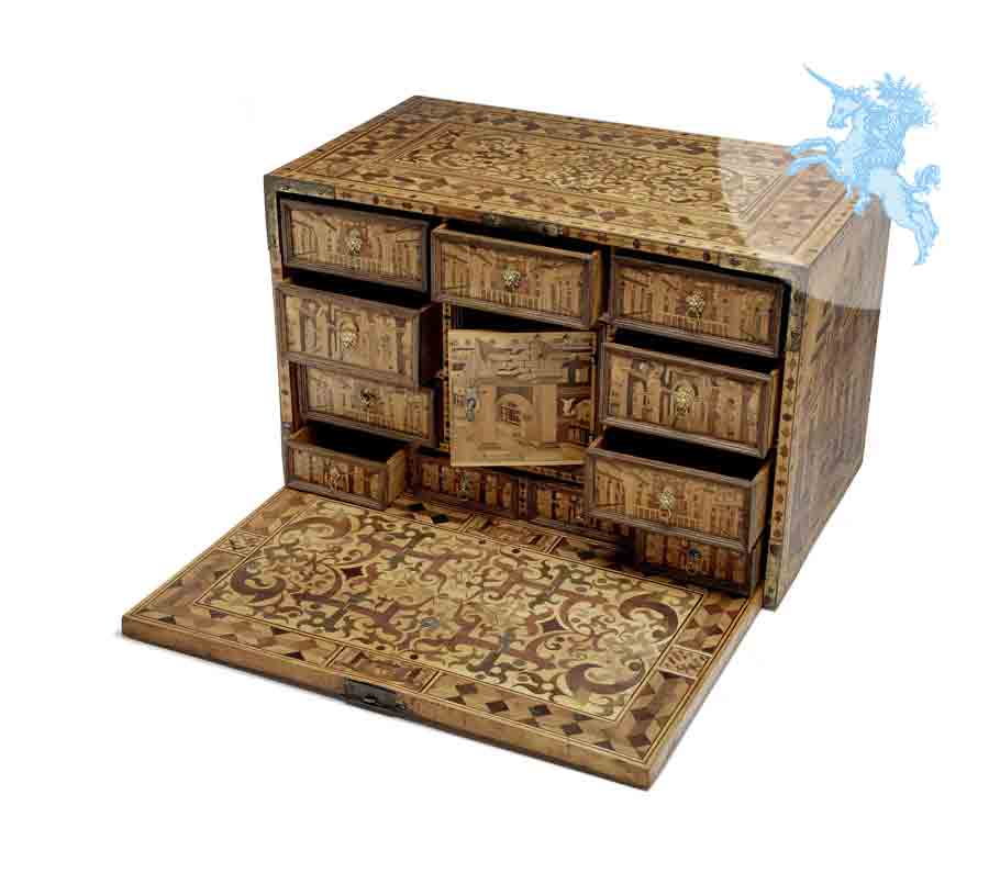 Cubic in form and structured as a fall-front chest, this magnificent “Schreibtisch” or “writing desk” belongs to the most elaborated collector’s cabinets created in Augsburg, the European capital of cabinetmaking, in the second half of the 16th century. It stands out through the refined inlaid veneer that depicts perspective vedutes of ruined building – a rare decorative scheme that rises two issues dear to Renaissance artists: the rules of linear perspective and the vanity of earthly life. Writing-cabinets with such sophisticated, inventive and precious marquetry are rare survivals indeed. Noteworthy in this connection are comparable Augsburg cabinets in the Germanisches Nationalmuseum in Nuremberg, the Bayerisches Nationalmuseum in Munich, the Victoria and Albert Museum in London, the Museo Lázaro Galdiano in Madrid and Veltrusy Mansion near Prague. These cabinets are dated to ca 1560 on the basis of their exceptional decoration with perspective vedute and probably coming from the same Augsburg Kistler workshop. The Nuremberg and Munich ‘writing-desks’ are attributed to the celebrated Augsburg Kistler Lienhard Strohmaier, who was probably also the maker of the other objects forming this small group of works, including the present perspective cabinet. Paul von Stetten, the eighteenth-century historiographer who chronicled the decorative arts in his Gewerb- und Handwerks-Geschichte der Reichs-Stadt Augsburg (1779), reported that a great many cabinets were made in Augsburg in the sixteenth century with ‘architectural representations in perspective, which few cabinetmakers, however, contrived to do successfully’. The only pieces he accounted among the few ‘real works of art’ were the ‘cabinets made with great artistry’ by Bartholomäus Weishaupt and Lienhard Strohmair. Strohmair is recorded as having worked in Augsburg since 1538 and until he died in 1567. A documented quarrel with the Augsburg City Council proves that he had the largest cabinetmaker workshop in Augsburg and specialised in the finest furnishings that he sold not only to the Imperial court but also to foreign dignitaries.