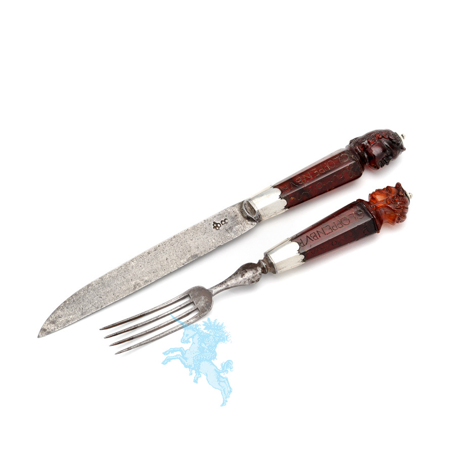 The ostentatious wedding cutlery consists of a four-tined fork and a knife with a long, pointed blade. The hexagonal handles are carved in two large pieces of translucent red amber representing the head of a woman and a man: in this case a bride and groom. Indeed, in the early modern period, it was tradition to present the bride with cutlery. In this case, a particularly elaborated and precious ensemble indicates that the bride was of high social standing. The name of the bride has also been inscribed on both sides of the handles: “Maria Cloppenbur[g]” (the “g” is probably behind the silver mount), a name common in the northern Germany. Comparable sets of wedding cutlery are on display in important European museums, for instance in the treasury of the Munich Residenz, in the Germanic National Museum in Nuremberg, in the Museum of Decorative Arts in Cologne, in the State Hermitage in St. Petersburg as well as in the Victoria and Albert Museum in London. Another similar cutlery set in Leipzig in the Grassi Museum is also worth mentioning, for the amber handles bear the inscription that they were made in Stolp, a small city in Pomerania, in northeastern Germany.