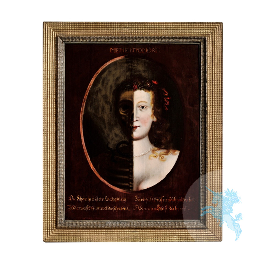The present painting is an example of a memento mori artwork and focuses on the fleetingness of human existence. In particular, the painting underlines the cursoriness of beauty. The painting displays the bust of a woman half living and half dead: on the one side at the peak of her beauty and on the other as a corpse in decay. The inscription on the painting underlines the purpose behind it: to warn humanity against excessive vanity. The attribution of this artwork to the Nuremberg painter Daniel Preisler is based on a comparison with other works by this master that have been preserved in Nuremberg in the Germanisches Nationalmuseum among other collections. Daniel Preisler was born into an exiled family from Bohemia that settled in Dresden in the mid-17thcentury. Preisler began an apprenticeship at the workshop of the Dresden court painter Christian Schiebling in 1642. After traveling, he settled in Nuremberg in 1652, where he worked foremost as a portraitist. In 1654 he painted a large formatted history painting of the fratricide of Cain and Abel for his entry as a master into the Nuremburg painter's guild. This history painting once hung in the conference room of the city hall in Nuremburg. Furthermore, he painted the two grand pianos of the organ from St. Sebald's church with portraits of famous musicians, preachers, and church administrators from the time. Paintings from Preisler have been preserved in the Anton Ulrich Museum in Braunschweig, in the Kunsthistorisches Museum in Vienna and in the Germanisches Nationalmuseum in Nuremberg. Although the vanitas theme was particularly popular for paintings in the 17th century, only a limited number of comparable artworks have survived.