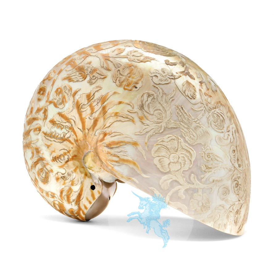 This magnificent Renaissance Chambered Nautilus shell is decorated in low relief that covers its surface like a net with tendrils, blooms and birds. On each side of the vortex, sea monsters are depicted with maws open to reveal pointed teeth. These motifs allude to the exotic material and its origins in Indo-Pacific waters, which were regarded by most Europeans as distant worlds full of arcana and monsters to be discovered. The artist has made adroit use of the three layers of the Nautilus shell: from the uppermost calcareous, porcelaneous layer, he removed the negative form of the designs down to the nacreous second layer of the shell with the patterns represented still revealing in part the reddish brown stripes of the outer, calcareous layer to stand out as if in relief against the nacreous ground layer. The low relief decoration was created by etching rather than excising and rasping or scraping. This is shown by the soft contours of the patterns as well as the edges of the hole drilled through the whorls of the shell near the vortex. An acid-resistant metal rod could be pushed through the hole to keep the Nautilus shell from touching the work surface during the etching process. An unmounted Chambered Nautilus shell is in the Duke Anton Ulrich Museum in Brunswick and another in the Kunsthistorisches Museum in Vienna, both of them decorated in low relief almost identical to that on the shell discussed here. The mid-17th-century date given for the present work is based on comparison with a mounted Chambered Nautilus shell in Detmold Castle of the Princes zur Lippe, which boasts stylistically similar etched decoration.