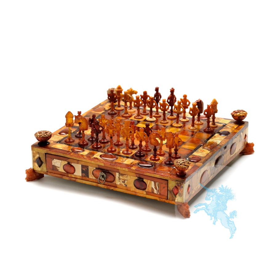 Die prächtige Bernstein-Spielkassette mit Schachfiguren zählt zu den eindrucksvollen Erzeugnissen der Bernsteinkunst aus der Zeit um 1700. Auf vier löwenförmigen Füßen erhebt sich der quadratische Korpus der Schatulle, der rundum mit Bernsteinplaketten verschiedener Größen und Farben in farbprächtiger Marqueterie bedeckt ist. Die Ränder zieren flach geschnittene Stücke von flumigem Bernstein sowie auch ovale und rautenförmige Cabochons von durchsichtigem Bernstein, die mit einer Goldfolie unterlegt und mit Hintergrundgravuren belebt sind. Auf dem Spielbrett wechseln sich viereckige Felder aus dunkelrotem, durchsichtigem und aus gelblichem, flumigem Bernstein ab. Diese zwei verschiedenen Arten von Bernstein nutzte der Künstler auch, um die zwei Figurensätze farblich voneinander zu unterscheiden, die üblicherweise schwarz und weiß, hier jedoch rot und gelb, gestaltet sind. Auf den dunkelroten Cabochons und Feldern des Spielbrettes sind Hafenlandschaften, Genreszenen, emblematische Darstellungen und allerlei Tiere wie Hirsch, Hase oder Einhorn dargestellt. An den Ecken des Spielbrettes erheben sich kleine, vollplastisch gestaltete Vasen mit Früchten aus Bernstein, die feierliche Erscheinung der Kassette betonen. An den Seiten sind wiederum zwei Schubladen angebracht, in die der komplette Satz von insgesamt 32 Schachfiguren Platz findet. Zieht man diese Schubladen heraus, so kommen König, Dame, Läufer, Türme, Springer und Bauern zum Vorschein, die in je 16 Kompartimenten mit einem Bezug aus blauer Seide liegen.
