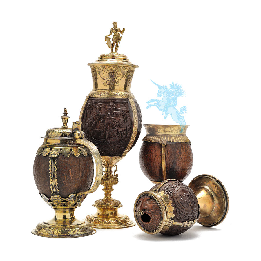Kokosnussgefäße waren bereits im Mittelalter begehrte Sammlungsobjekte. Die "indische Nuss" oder "Meernuss", wie sie einst genannt wurde, war bis ins 17. Jahrhundert hinein ausgesprochen selten und besonders beliebt. Ihr wurden medizinische und gar magische Kräfte zugeschrieben. Bereits in der arabischen Heilkunde spielte sie eine besondere Rolle als Allheilmittel. Seit dem Mittelalter wurde ihr außerdem eine giftanzeigende Funktion zugesprochen: Der Herzog von Berry besaß beispielsweise einen Kokosnussbecher an dem eine Natterzunge befestigt war - eine Kombination, die einen doppelten Schutz vor vergifteten Speisen und Getränken gewähren sollte. Der Glaube an die Heil- und Schutzkraft der Kokosnuss erklärt, warum die Nussschalen meistens zu kostbaren Trinkgefäßen verarbeitet wurden. In den Kokosnusspokalen und -bechern sahen die Menschen des 16. und 17. Jahrhunderts jedoch viel mehr als Gefäße mit Heilkräften: In den montierten Nüssen offenbarte sich die Fähigkeit des Menschen, eine seltene Naturalia durch kunsthandwerkliches Können in eine kostbare Artificialia zu verwandeln. Und solche Artificialien bildeten den Grundstock einer fürstlichen Kunstkammer. Die Gruppe von prunkvoll montierten Kokosnusspokalen zeugt somit in eindrucksvoller Weise von der Sammelkultur, die sich in Gestalt der Kunst- und Wunderkammer um die Wende zum 17. Jahrhundert in den deutschsprachigen Territorien durchsetzte.